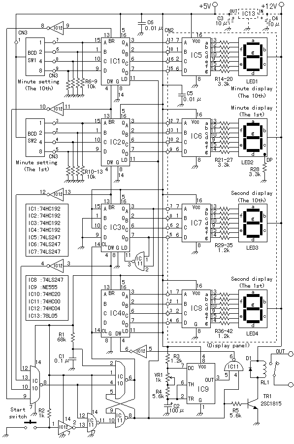 Circuit 1: Our prototype circuit acts only as a timer for our desired circuit. The 555 Integrated Circuit Timer sends a pulse that is passed on to the 7493 IC Counter. The 7447 decoder would then show the output through a 7-segment display. As was said, the 1st circuit is only a timer since we weren't able to reach the starting and stopping of the circuit's countdown. Circuit 2: The 2nd circuit is the circuit that we wanted to build but unfortunately weren't able to due to some circumstances. The 2nd circuit features four seven-segment displays to act as the display of the counter, four 7447 decoders for the display, four 74192 Presettable Synchronous Up/Down BCD Counters, a 555 timer and numerous other IC's. The 2nd circuit, unlike the 1st one, has a flip-flop that acts a control circuit for the starting and stopping of the Time-delay. Here is the explanation for the circuit: The counters are divided into two parts, the first one would be the second counter and the other would be the minute counter. With this circuit, we would be able to countdown from 59 minutes, 59 seconds to 0'0". With this desire comes a complication – the ten's counters should only be able to reach the number 5, this is solved by presetting the 74192 counter for the ten's to 5. When counting, a countdown circuit counts from the higher to lower set of numbers (in this circuit's case, from 59'9" to 0'0"). To accomplish this, the 74192 counters count the high to low transition of the signal from the 555 timer. The 74192 at the 1's second counter would countdown from 9 to 0 and would then borrow from the 10's second counter. The cycle would continue as the 1's second counter countdown's to zero and borrows from the 10's second counter until it reaches zero, and would then borrow from the 1's minute counter (and then to the 10's minute counter when it hits zero). The circuit should stop when it reaches 0 minutes and 0 seconds. The next part that would be explained would be the flip-flop that is used for the starting and the stopping of the circuit. When the switch is turned on and if the timer is not equal to 0'0", the output would be high (its working condition). But if the timer is 0'0", the output of the flip-flop would then be low and the countdown would stop having reached its limit. When the start switch is turned off and then turned on though, the countdown would be reset and it would start again. *2nd circuit downloaded from the Hobby of Electronic Circuit Engineering Website |