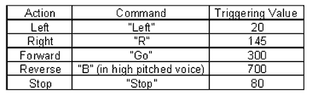 The main program that runs all these functions, including the MEX-files, is the PC.m. This program implements the threshold triggering in order to decipher from "left", "right", "go", "back", and "stop". This program records a voice command from the user and saves the file to disk. It then commences to call the Wavchop and Jfilt functions to filter the voice sample. After that, it would proceed to compare which threshold is triggered by the sampled voice. When it has finished with the voice analysis, it would then call on the corresponding MEX-file which contains the command that determines which data port must be turned high. The table below lists the commands that the RC can do and the corresponding commands that the user must say.